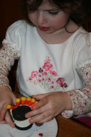 – Place candy corn, points down, in between the oreo cookie that is standing on it’s side.