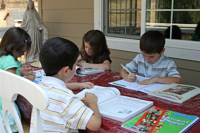 We tried just being outside the other day and it was hot and BUGGY. I am sqweamish about bugs, and they seem to be invading our property. I think I might have to think about a sunporch schoolroom. The brightness of the outside porch looks so inviting and productive.