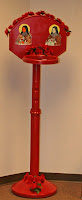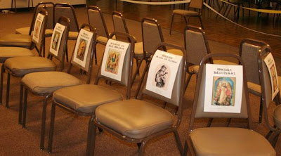 Place the chairs in an oblong circle facing outward. Tape a sign to each chair containing the name (and picture if you’d like — I found beautiful images online and printed them onto card stock… They have lasted year after year.) Make a duplicate set of the saint’s names and place them in a jar.