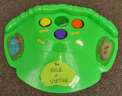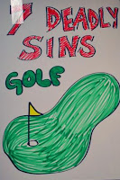 Last year we decided to change it up a bit and changed the name to Seven Deadly Sins Golf. For this game, golf balls, labeled with the seven deadly sins, are putted into the “Hole of Virtue” (hole/holes labeled with the virtues), using a golf club “Stick of Virtue.”