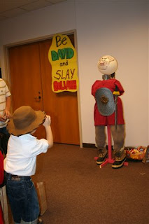 The object of this game, is for the children David to try and “slay” Goliath by tossing a ball of foil stone at his head.
