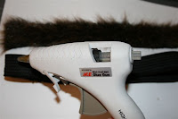 I used a piece of Faux Fur from my boys dress up bin, a Black Headband, and hot glue.