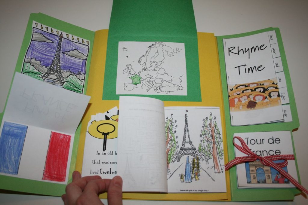 - In the middle (on the top page) is Where in Europe is France (We located France and labeled the Atlantic Ocean), a pocket for the 12 girls, and a Madeline Coloring Book.