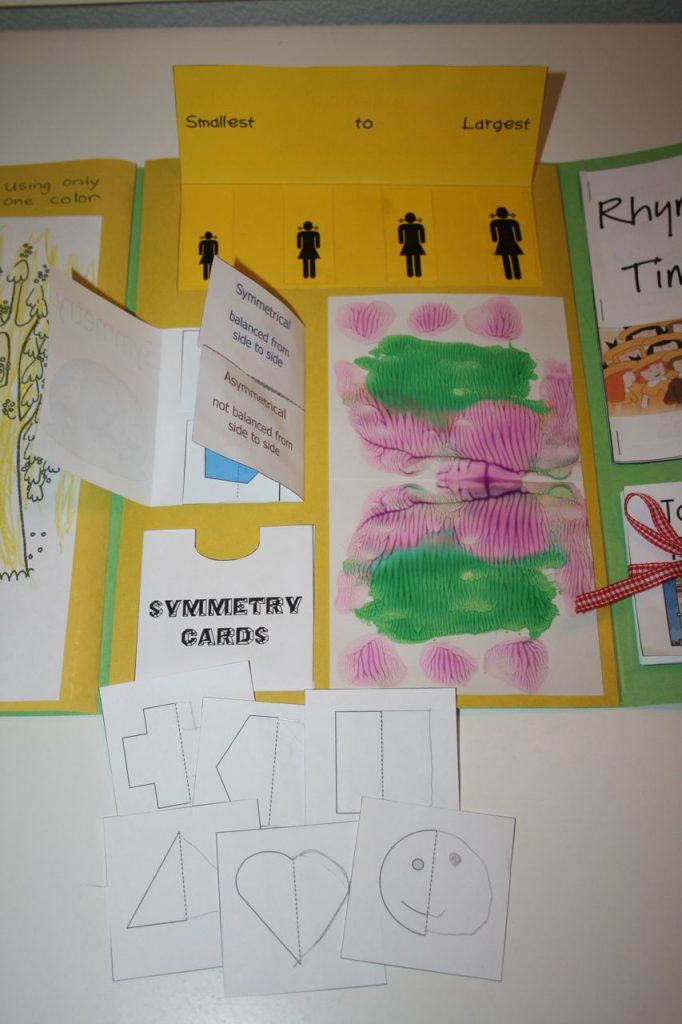 - On the Right is a Relative Size Miniture Book, a mini book on Symmetry, Symmetry Cards, and a Symmetrical Painting.
