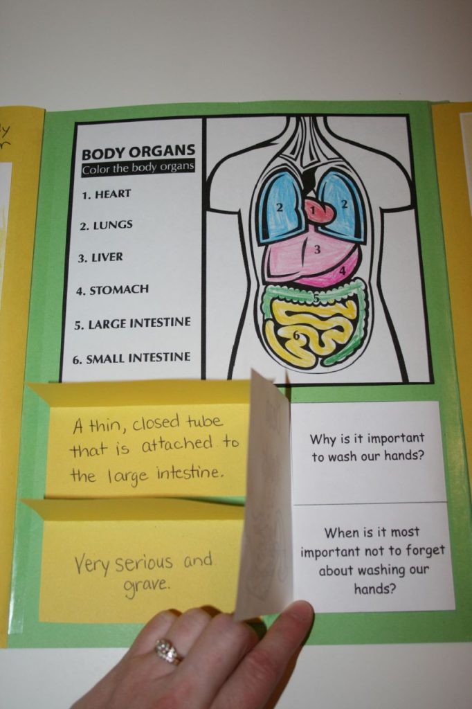 - In the middle is our worksheet on the parts of the body, a mini book on clean hands/health, and he definitions for “appendix” and “solemn,” a couple of the challenging words from the book.