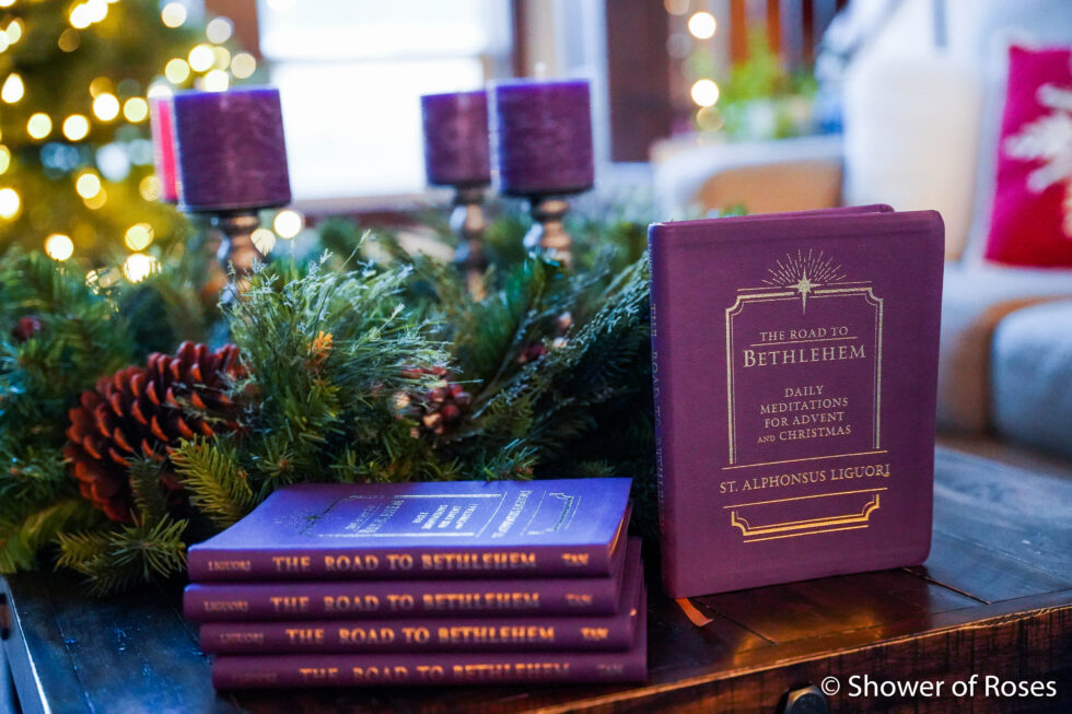 Additionally, we have a larger wreath adorning the coffee table in our living room. This one is lit during our family rosary each evening, and we leave it aglow while unwrapping and reading from our cherished annual Advent Book Basket.