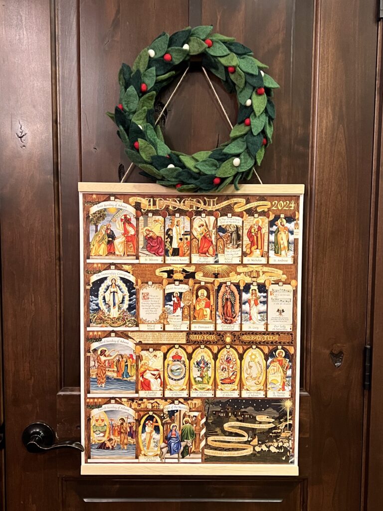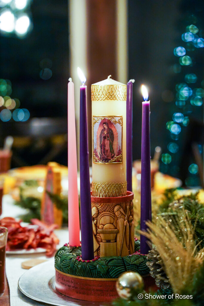 The Our Lady of Guadalupe Candle in the center is from Clear Creek Abbey. (Also available from Amazon.) While I’ve yet to bring myself to burn it, it adds a lovely touch to our Advent decorations.
