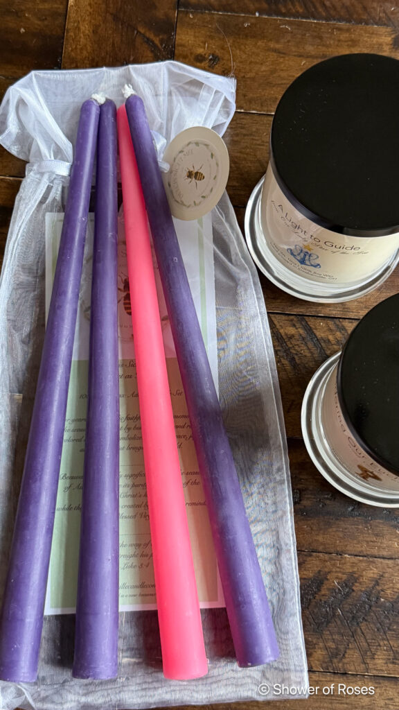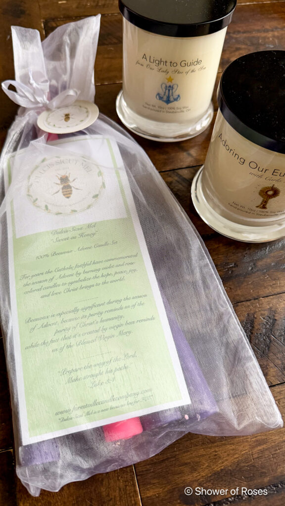 You can also find gorgeous 100% Beeswax Advent Candles—hand-poured in Lavender and Rose and Deep Violet and Rose by two talented Catholic college students, Abbey and Anna, over at Forestville Candle Company! 🌲