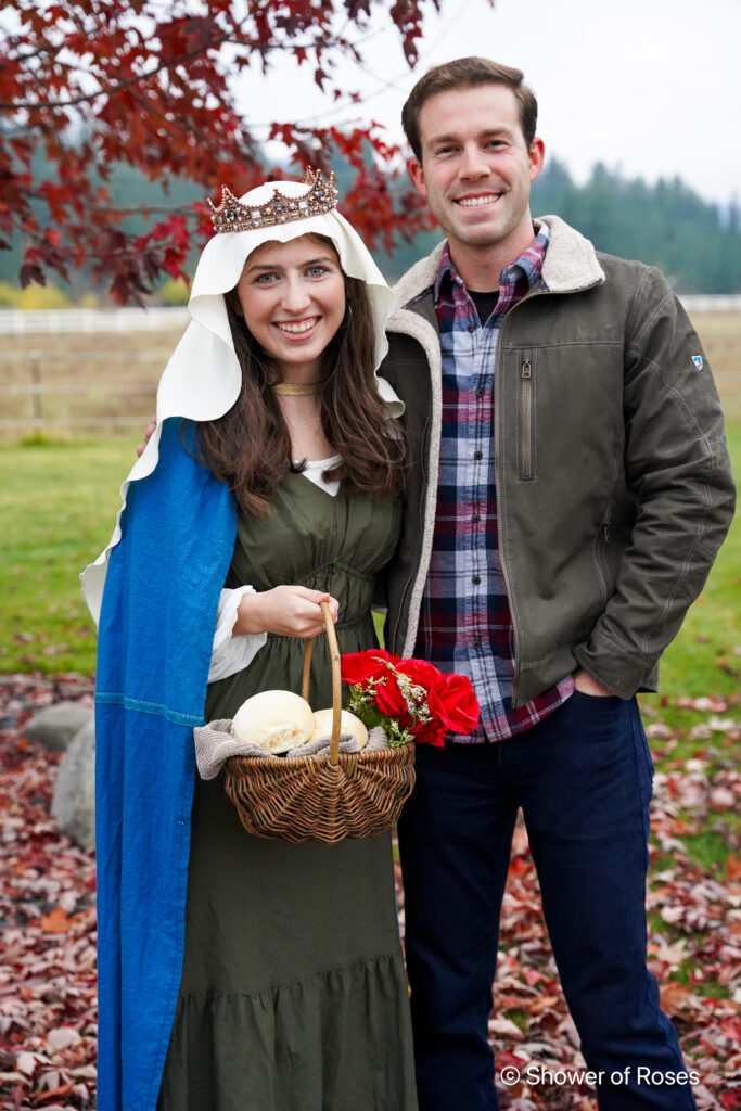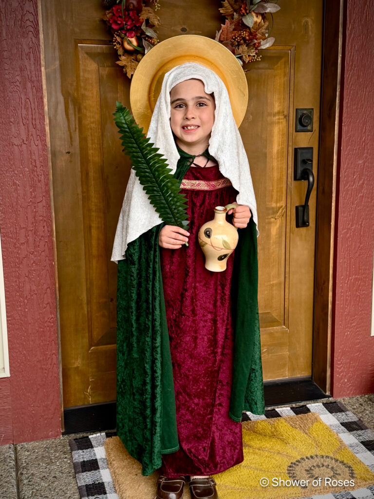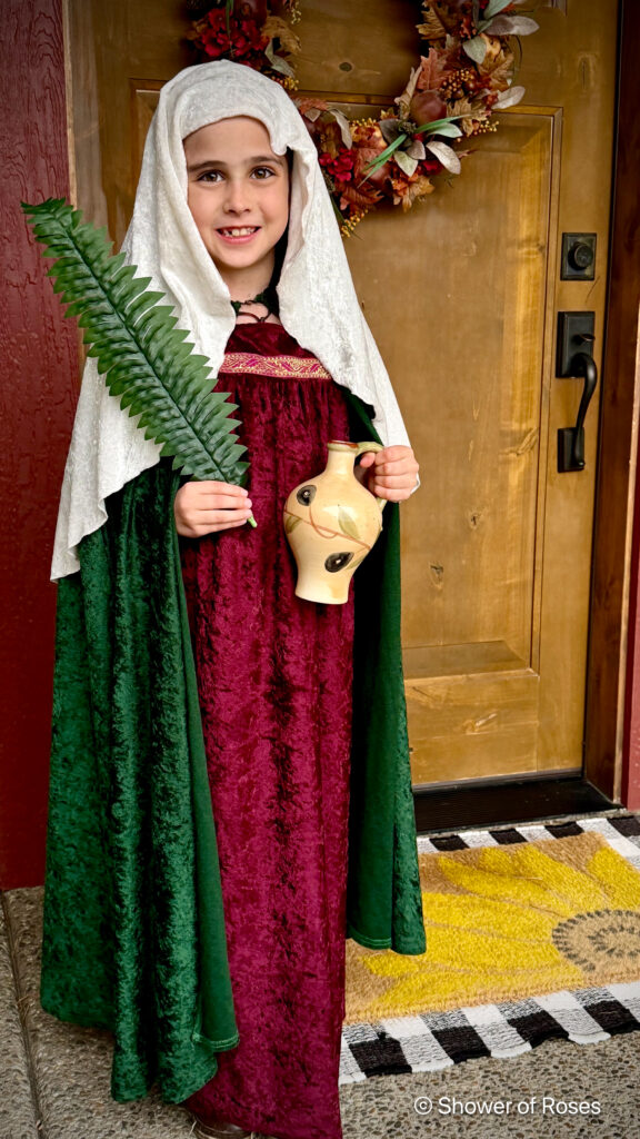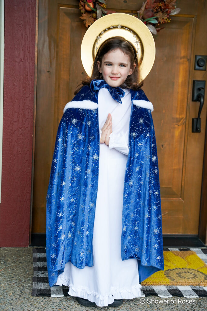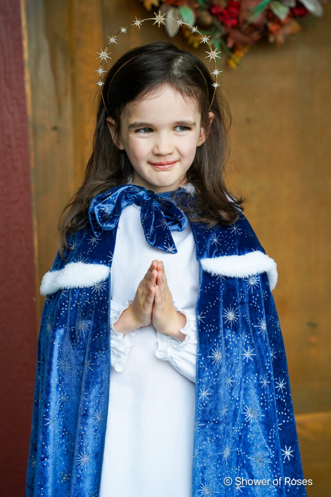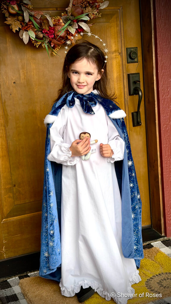 Her costume was simply one of our St. Lucia Day nightgowns with a crown of stars (previously used for Our Lady Queen of the Angels in 2022), and this beautiful cape from Trish Scully. I ordered the cape as one of her Christmas gifts last year with this costume in mind. It’s actually a size 10/12/14, but I wanted it to be long on our tiny 6 year old! I meant to get a picture with her hood on, but I forgot… Oh well! She also went inside at one point to get her Baby Jesus doll (also in this Holy Family set) to hold.