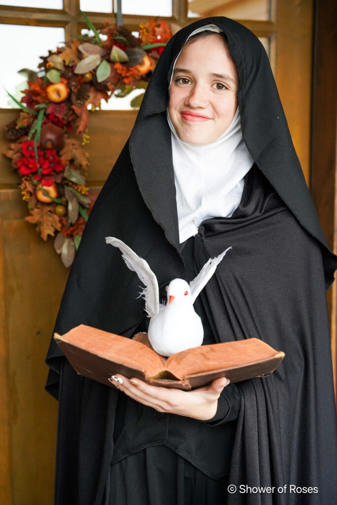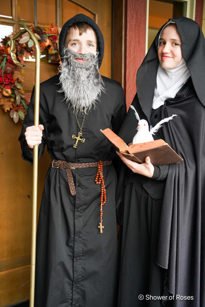 She also choose to dress up as her confirmation saint this year and younger brother agreed to be, St. Benedict, her twin! His pics coming up next… She used a veil/whimple from our costume collection, some black fabric for her cape, this and this black dress (from one of the servant costumes from this Murder Mystery). She added an old book from one of our shelves and this dove!