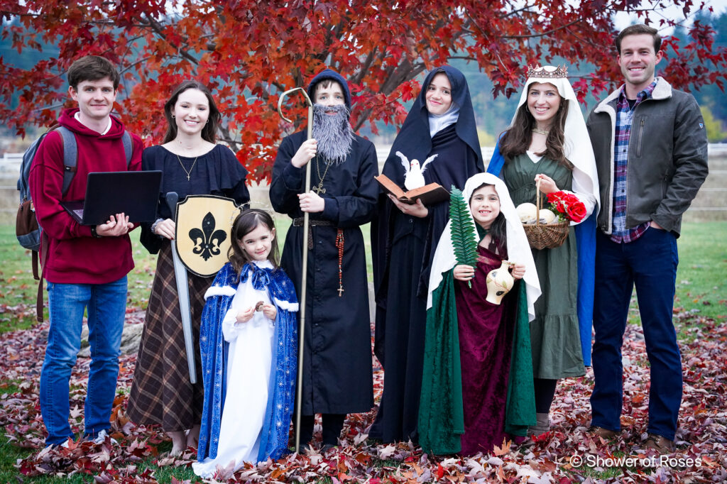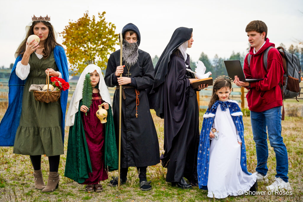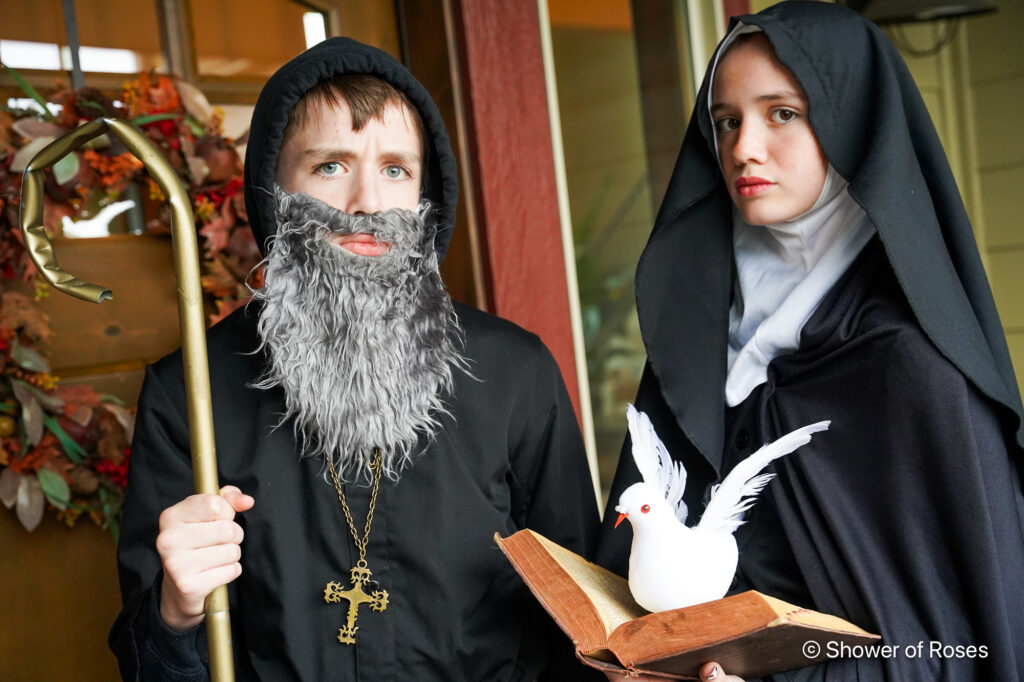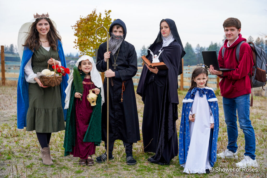 This year’s saint costumes: St. Elizabeth of Hungary, St, Carlo Acutis, St. Scholastica, St. Benedict, St. Anastasia and Our Lady Star of the Sea (Stella Maris).