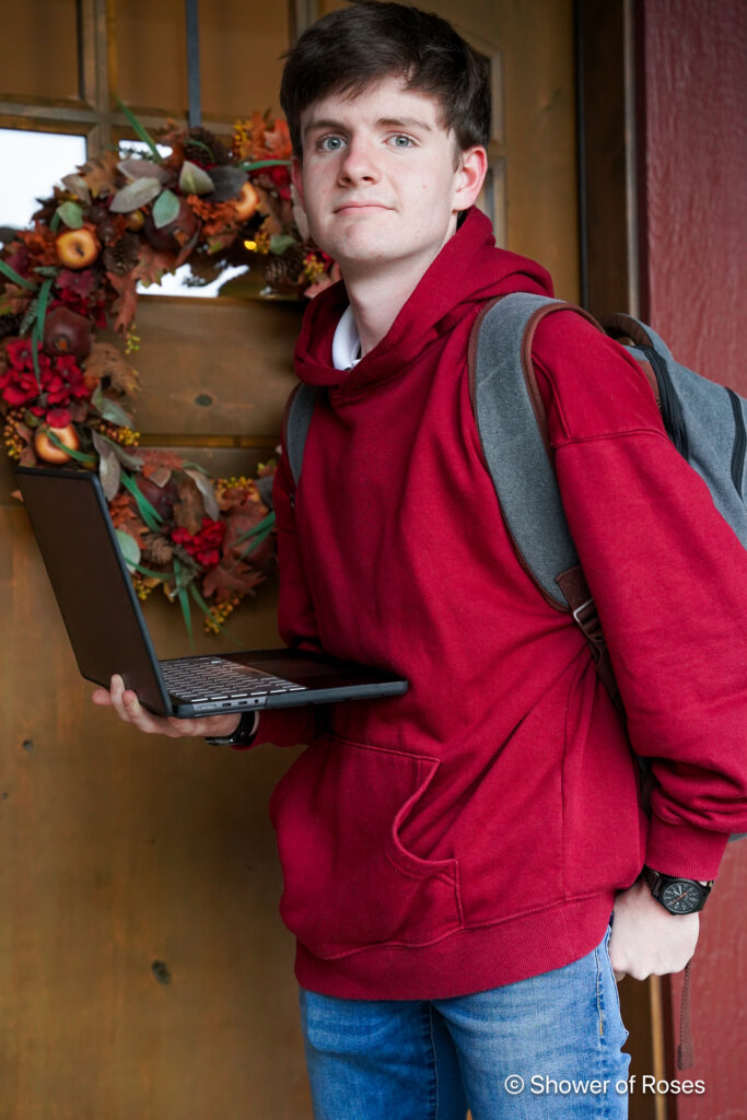 He had just arrived home from University of Mary for the weekend, found a red hoodie from his closet, pulled his laptop out of his backpack, and then just put his backpack on! Not perfect but it worked!!