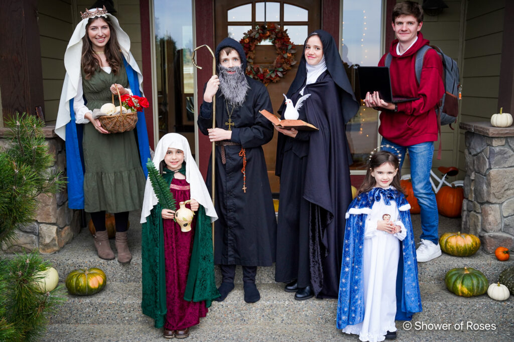 Other than our youngest two, our saints costumes all came together at the very last minute this year! I loved their creativity. One of our college kids flew in for the weekend and his older brother (jokingly) asked in our family chat if he dressed up as himself this year….. Nope, he did not! Yay for newly canonized saints this year!!