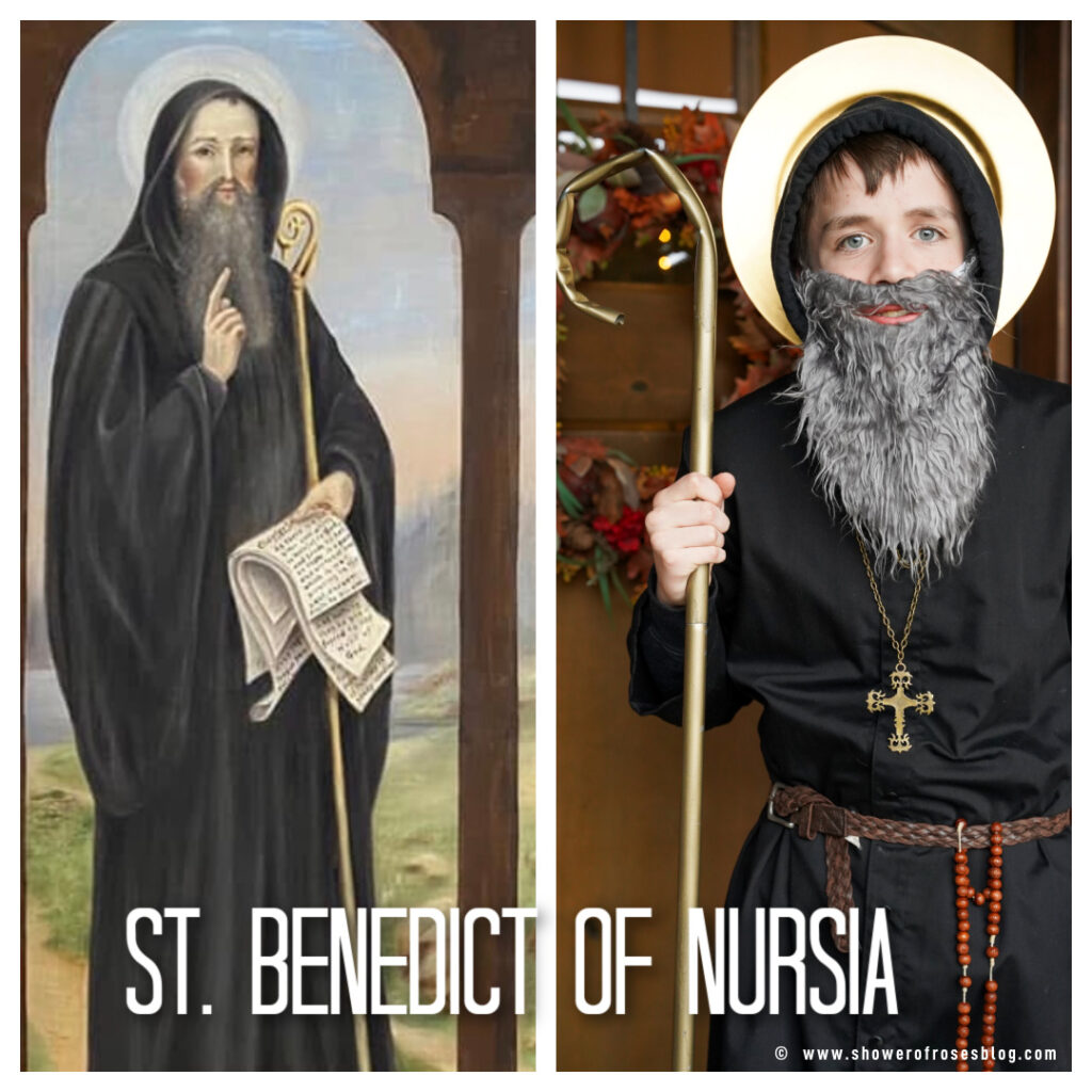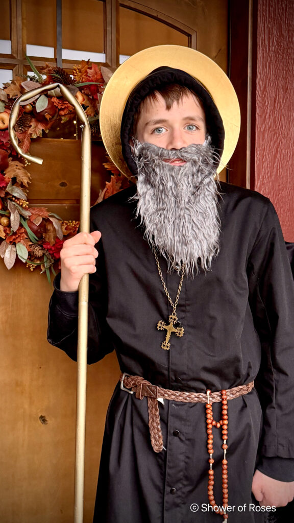 I am realizing I don’t have a lot of costume options for the older kids! However, they are so creative and find things that work! He ended up using a cassock combined with a black hoodie. Then just adding a belt, rosary, cross, the crozier his dad helped him make a few years ago for his St. Augustine costume, and an old gray beard from his older brother’s St. Paul costume back in 2012.