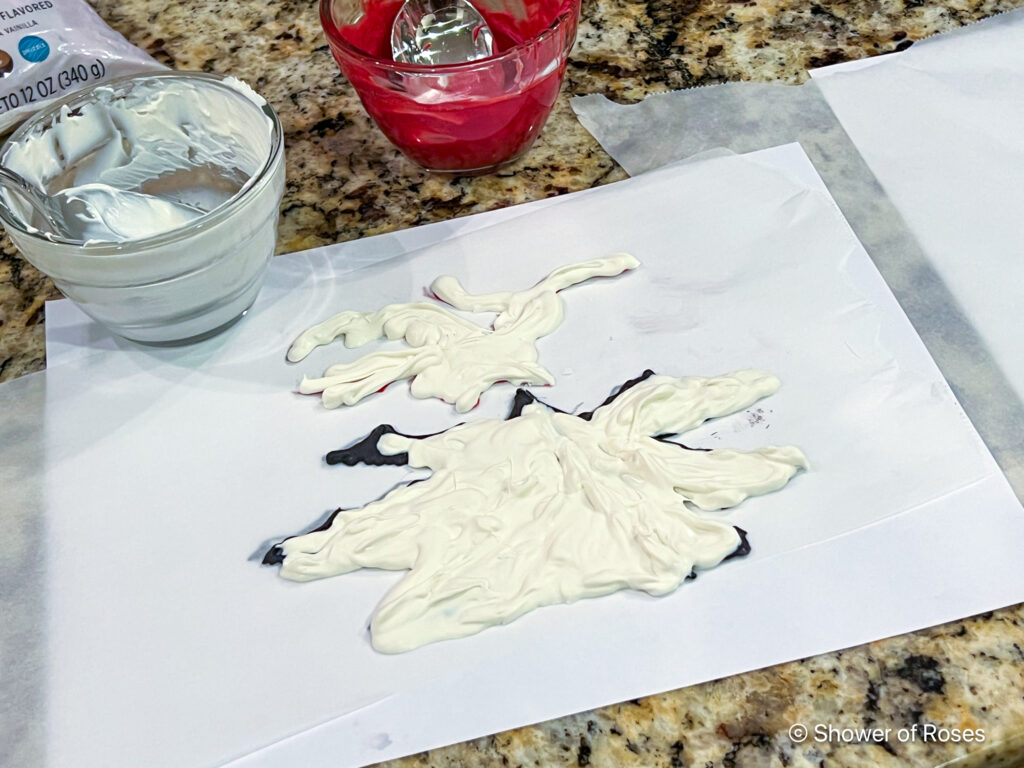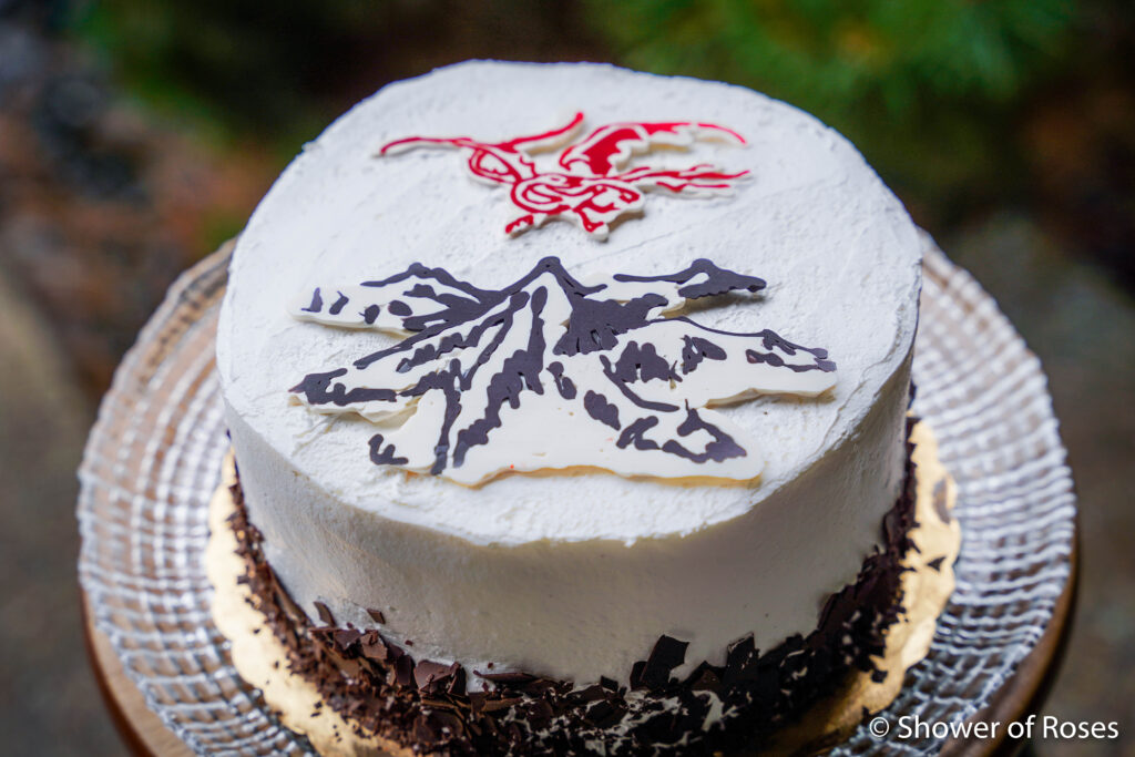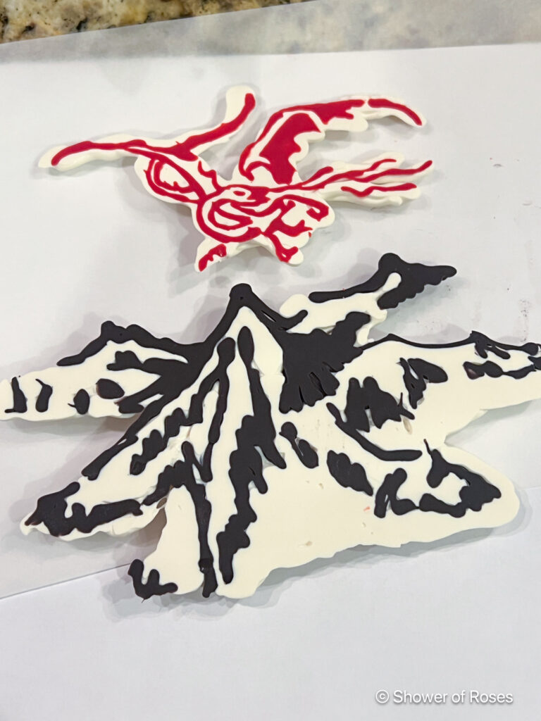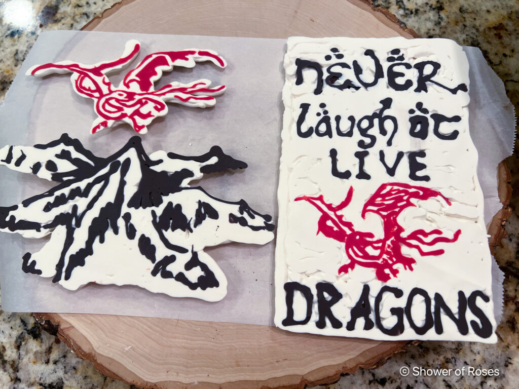 The other Tolkien themed candy melt cake toppers were options to go on top of a Cold Stone ice cream cake we picked up the day of the party— because Tolkien themed birthdays (especially 18th ones) sometimes call for second cakes. For those I used black candy melts for the text and mountain, and red for the dragons. I then covered it all with white candy melts for the background.