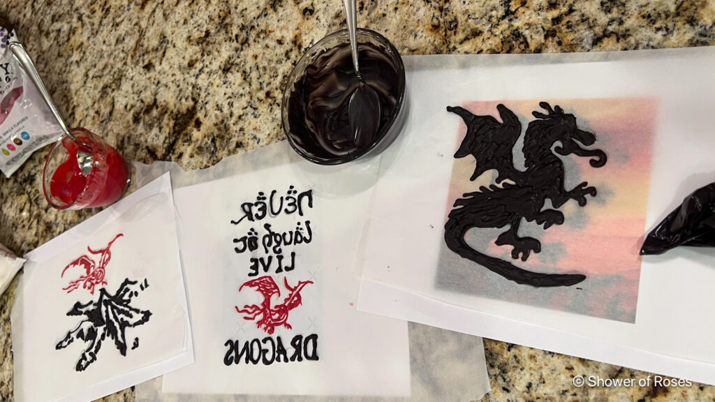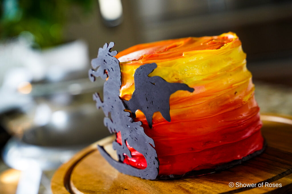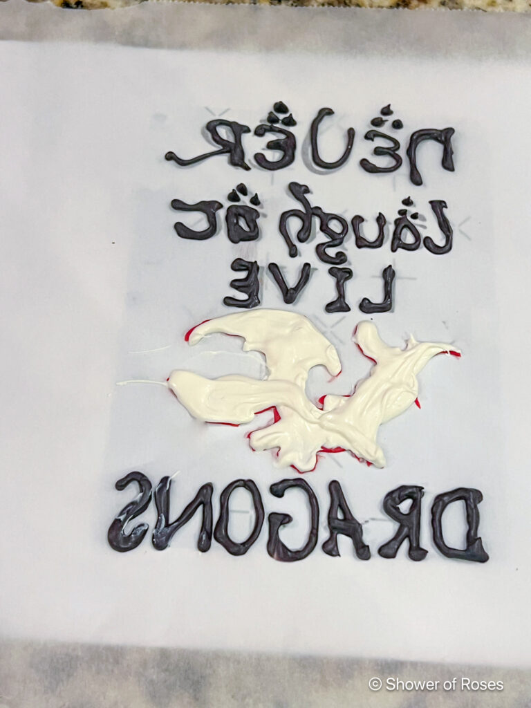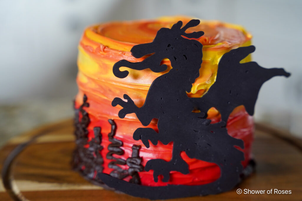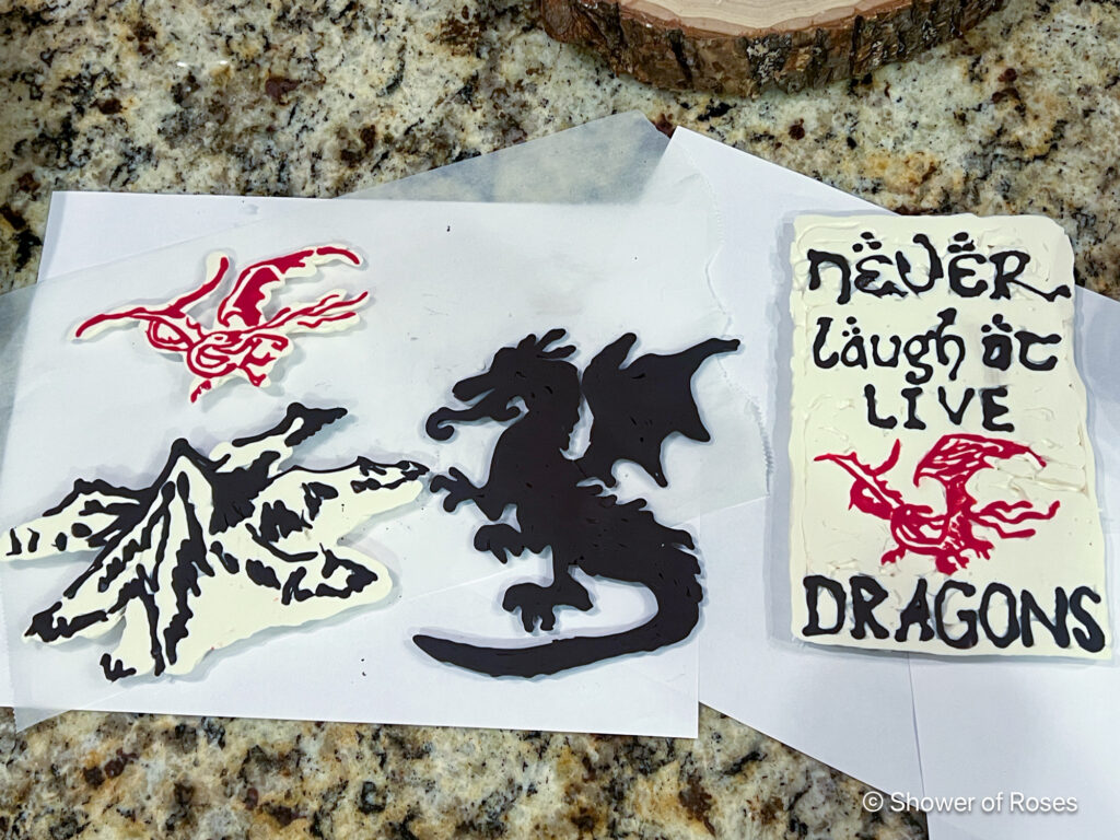 To make the dragon for the little three layer six inch cake, I found an image of a similar cake online, printed out a picture of the dragon and then piped black candy melts onto parchment paper, making sure it was thick enough to not break apart once it hardened. I have made lots of different cake topped this way using clip art and silhouettes.