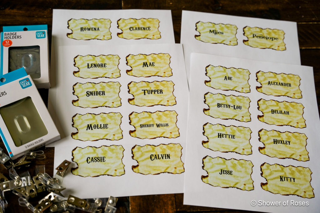 The name tags come with the download. We use Badge Holders and Clips from Walmart, though you could order some online too. I had been reusing my original ones for each party, but after the one I hosted in December of 2023, I missed taking the name tags out (I had just gotten over shingles and then broke my leg/still in rehab… so many things got forgotten!) so the ink bled onto the plastic and we had to replace them this time. At least we got a lot of use out of them first! So, tip, if you want to reuse, remove name tags before storing! 😉