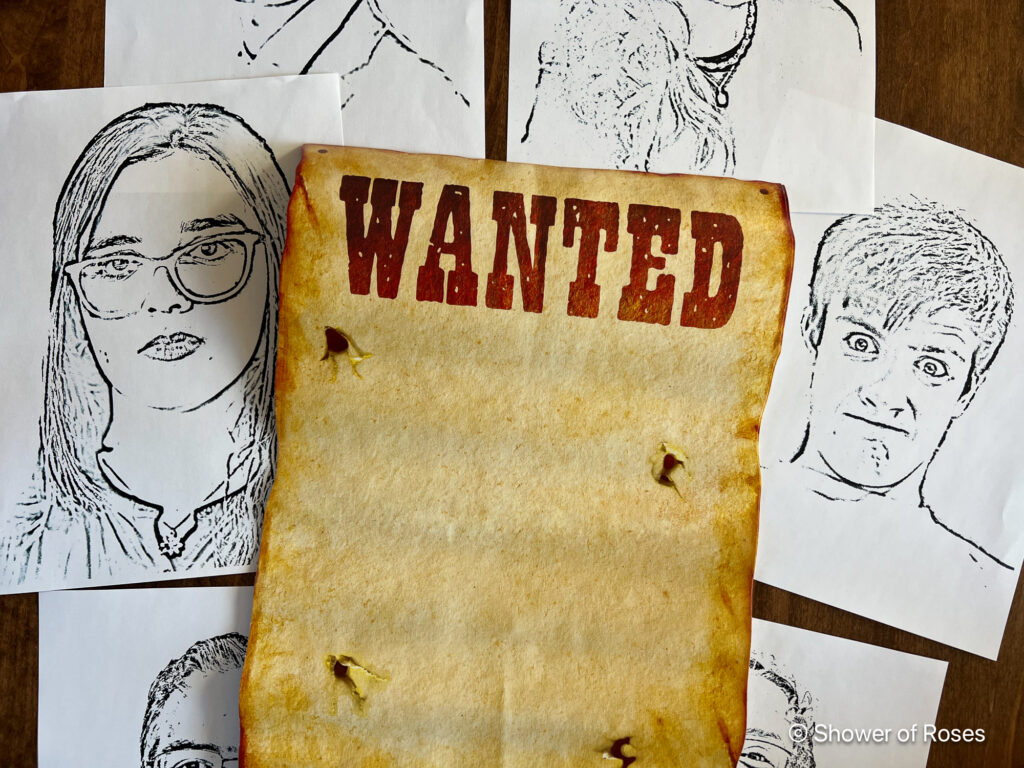 I really love this aspect of these mystery parties! So fun for everyone and I never peek into “The Big Reveal” until I read it at the end, so I don’t even know who the culprit is! Surprisingly, of the five parties I’ve hosted for this crowd, I’ve had one of the guys end up the murderer twice now, and one of my daughters (off at college for this one, hence one of the Wanted images!) has been the murder twice as well!