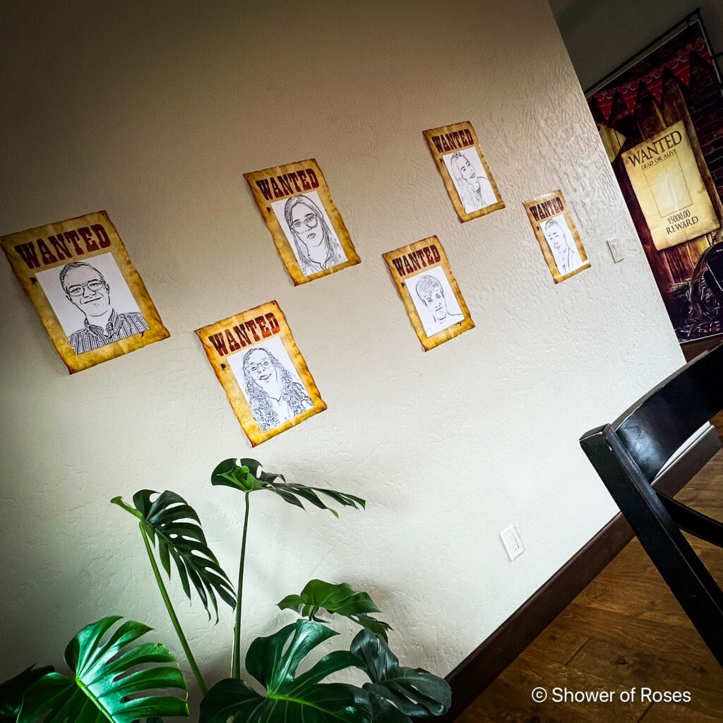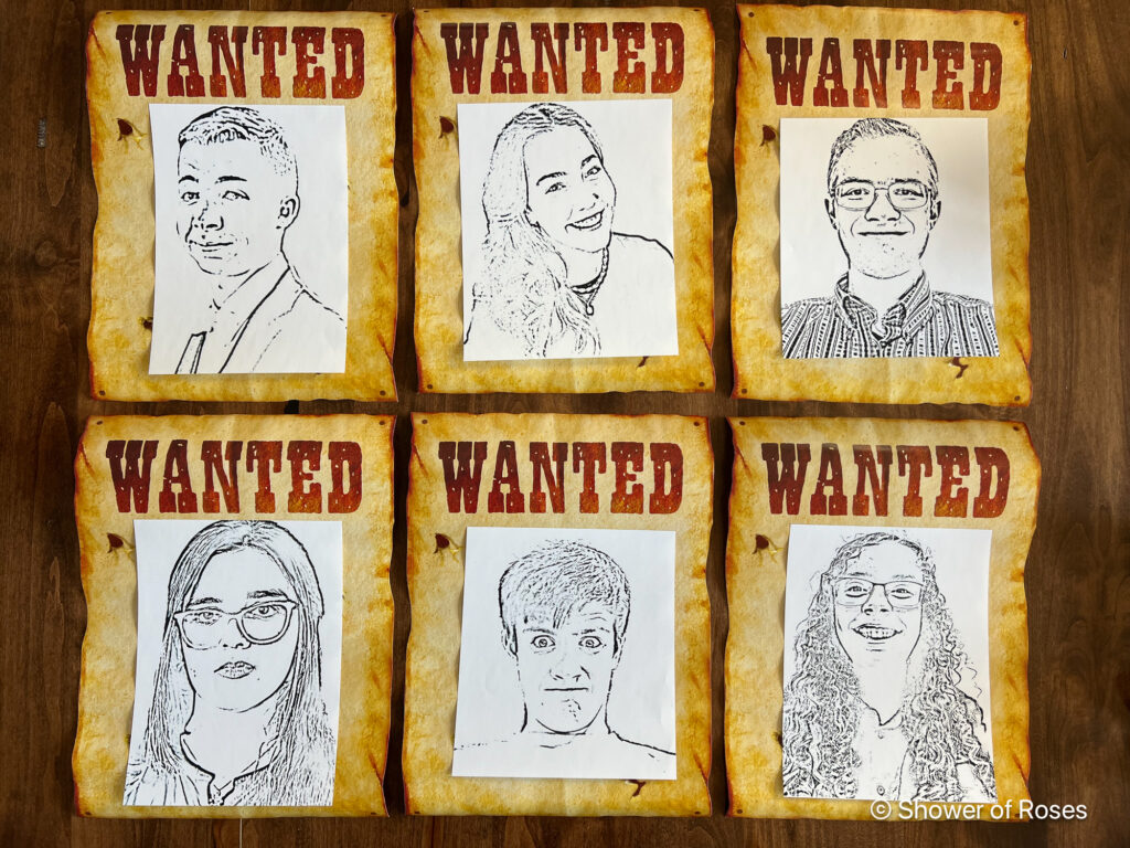 I had so much fun with this! In addition to including our guest of honor, to make wanted posters of some of the young adults who have attended our parties in the past and wouldn’t be at this one! I included my two college kids plus the Carmelites I had hosted parties for in the past and one other young man who is now in seminary!