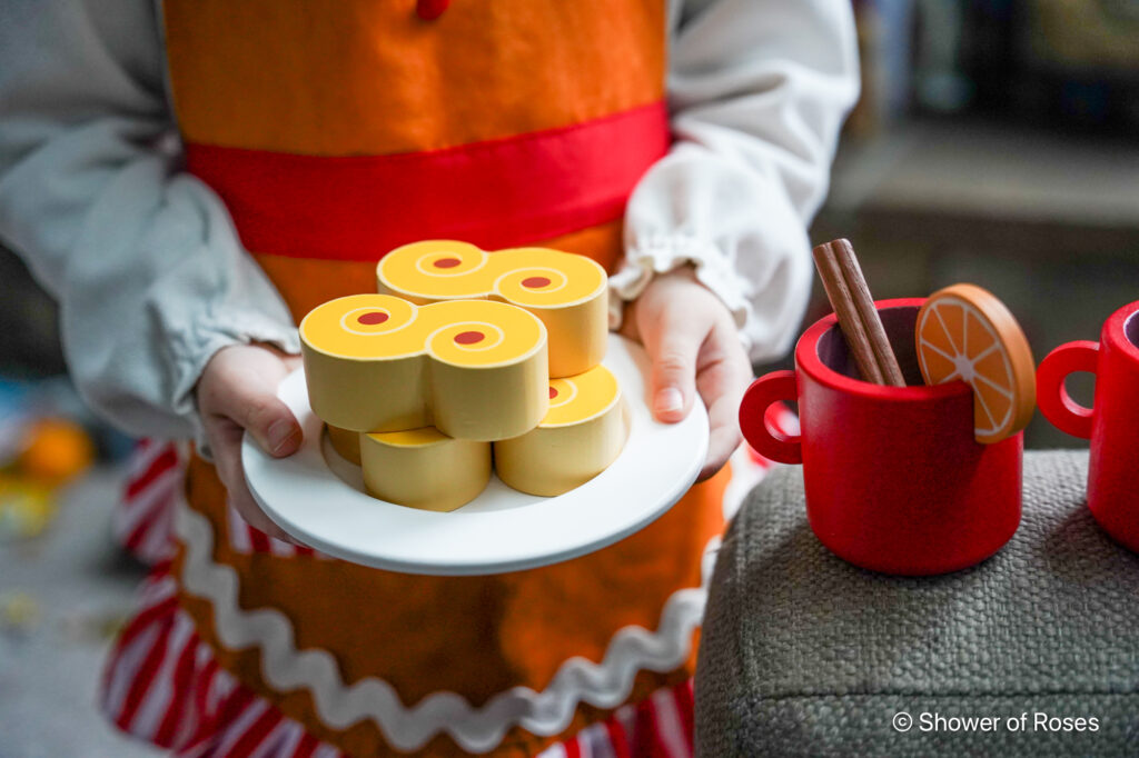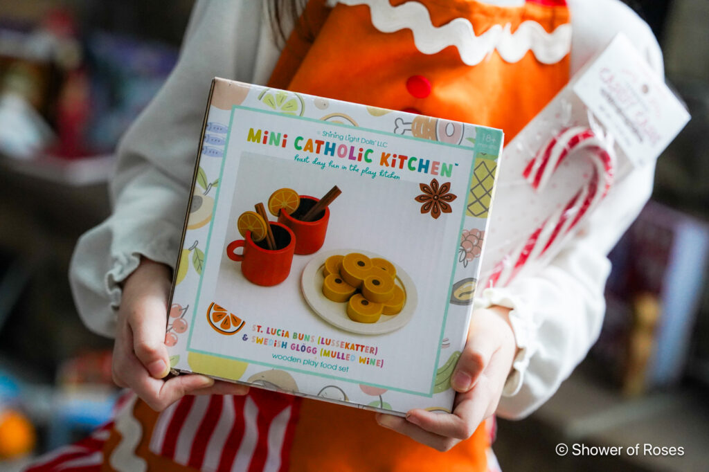 The Mini Catholic Kitchen (specifically this St. Lucia Buns (Lussekatter) & Swedish Glögg Wooden Play Food Set) is my FAVORITE Shining Light Dolls new toy release since their Double-sided Advent to Christmas Wooden Wreath Set. It is SO darling!