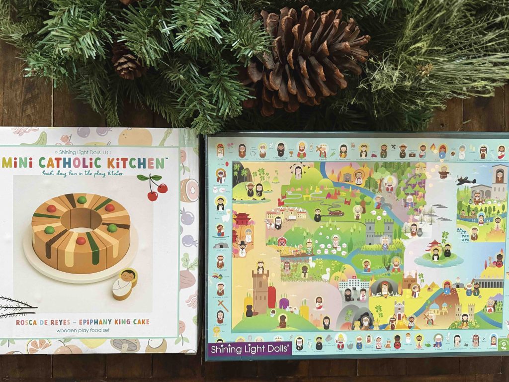 Includes Mini Catholic Kitchen Rosca De Reyes Epiphany King Cake and Saints & Symbols Search & Find Giant Floor Puzzle 24″ x 36″ sponsored by Shining Light Dolls ($64.98 Value)