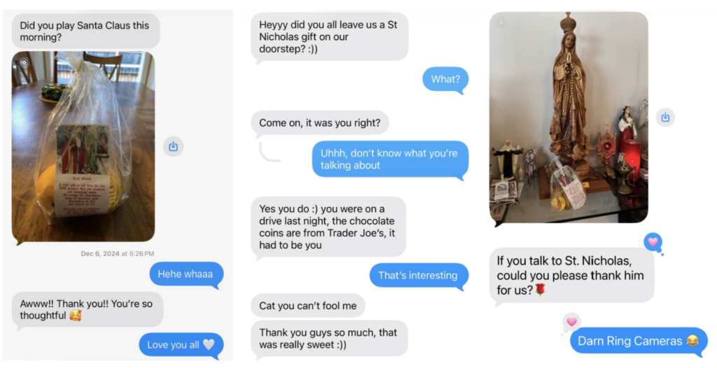 Last year a few of them put together fun little treat bags—just chocolate coins and cuties—and secretly dropped them on friends’ and families’ porches. It ended up being such a fun and easy way to spread a little love just like St. Nicholas!