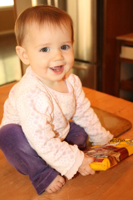 Our little Rose… is turning into a toddler way too quickly! Her bottom right tooth was the first to break through on Aug 25th, and tehn her left bottom tooth and top left tooth came in this week. She is standing up (but not get walking) on her own. Oh, and she also loves to climb! Thankfully Hubby had just lowered the mattress (again!) to the very lowest setting a couple weeks ago.