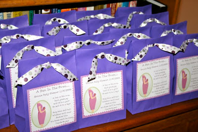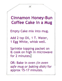 Instead of muffin mix, and keeping with the theme, I sent each of our guests home with a mix to make Cinnamon Honey Bun Coffee Cake in a Mug! (I found the recipe here.)
