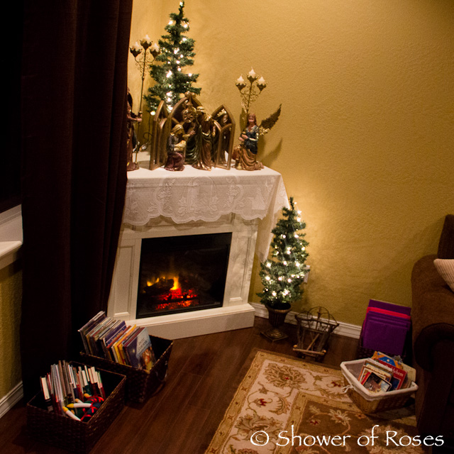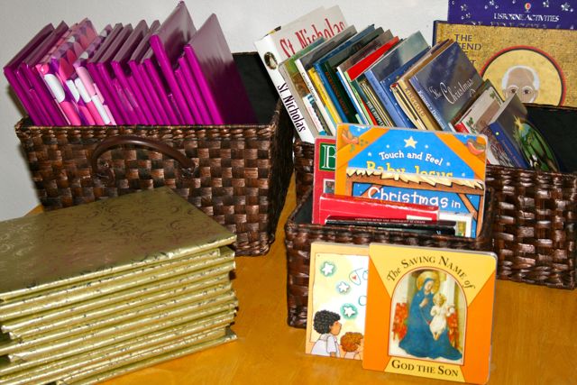 As you probably noticed in my last post, I did end up wrapping some of our Advent and Christmas themed picture books in purple, pink and gold paper for the children to unwrap each day during Advent and over the twelve days of Christmas, like we have done for the past few years now. I usually wait until Christmas morning to add the twelve books wrapped in gold for the twelve days of Christmas, but since Advent is short this year, and I had extra room in the basket, I went ahead and included them as well. I then piled the remaining books in a few additional baskets and moved them to the living room so they are readily available.
