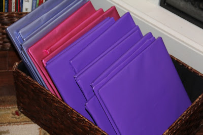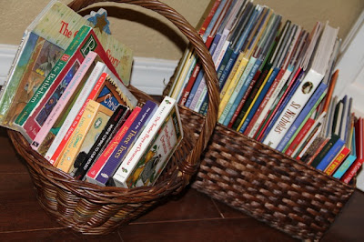 Our collection has grown so much over the past years, and I was having such a hard time choosing books to wrap! How was I going to decide which ones to focus on this year?!? I finally gave up and asked all the kids to choose four favorites each off the shelf and bring them to me... They were all very excited and I ended up with a nice big stack of 25 books, since someone (Rose) apparently snuck in an extra!