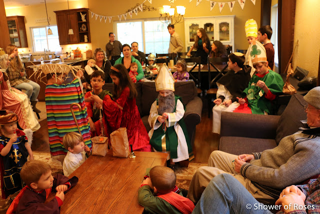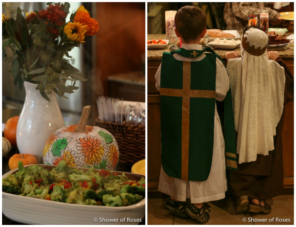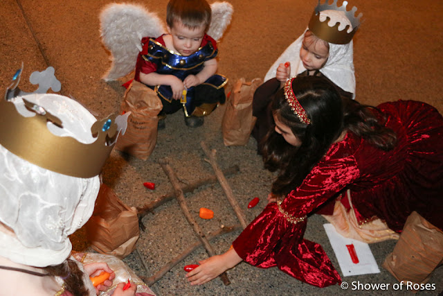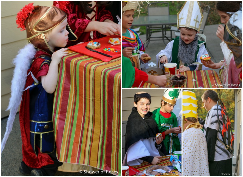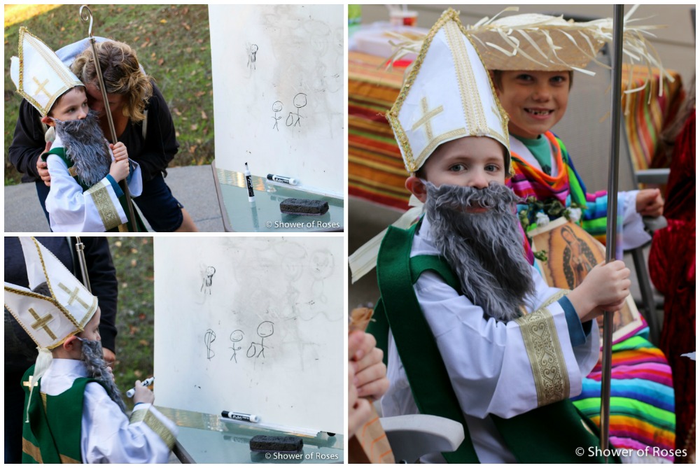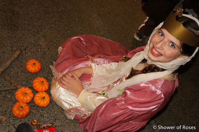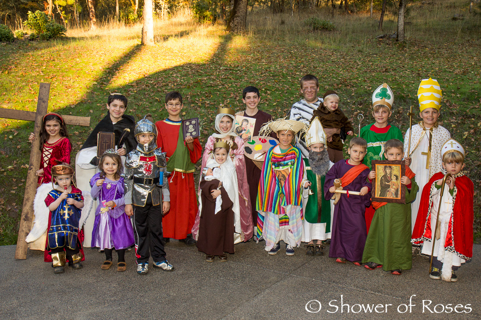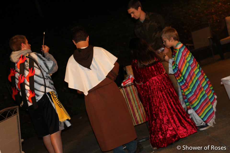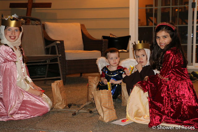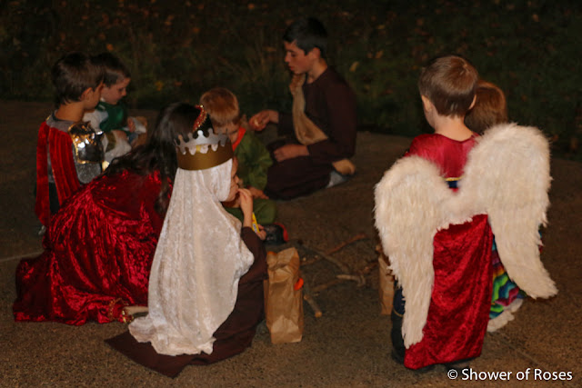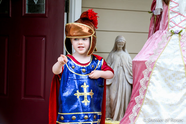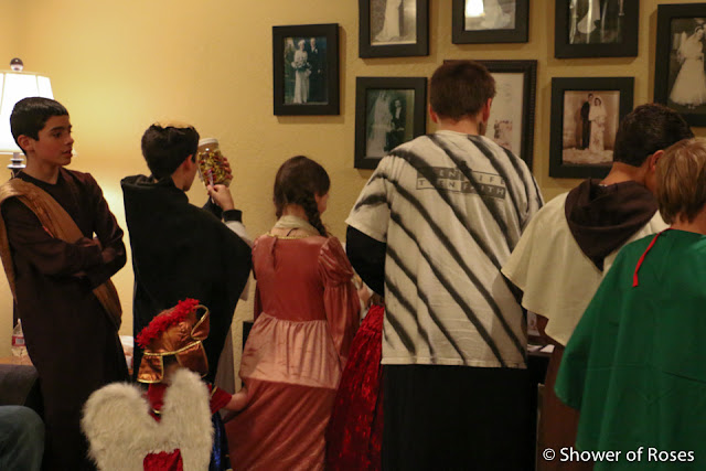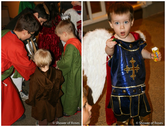 Other than ordering a new St. Teresa costume for our oldest daughter, following the canonization of Mother Teresa, we hadn't put any thought or energy into this year's costumes... Friday afternoon we finally pulled out our two costume boxes and threw together costumes before heading to the church. This is one of those years when I've been very grateful to have a nice collection to choose from!