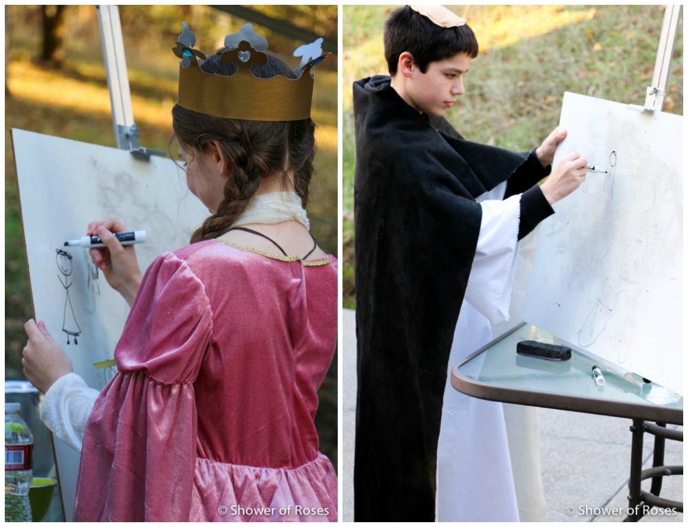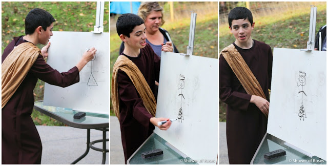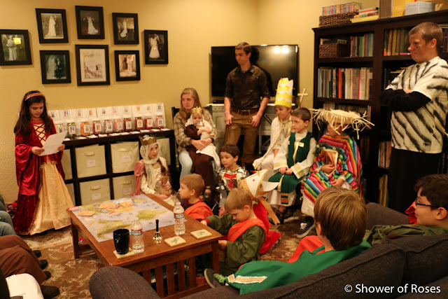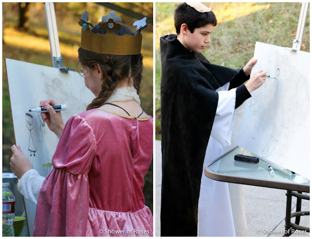 Our high schoolers didn't dress up, but they are wearing the "saintly" t-shirts that they received in their Easter Baskets earlier this year! Ranger (14) is wearing his St. Peter (and all the popes) t-Shirt and Captain (16) is wearing his St. Benedict t-shirt.