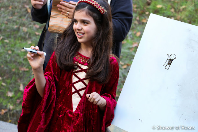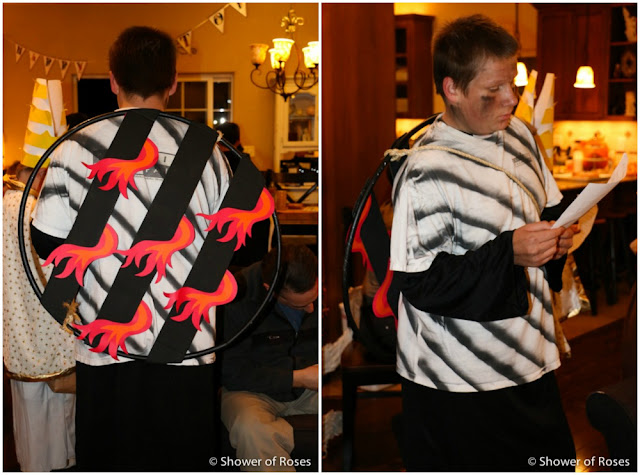 Costume: For her costume she used the same dress as last year, but turned it around so it was solid blue in the front. (You can find the Blue Renaissance Princess Costume in a size medium over at Amazon - it's an amazing price right now... Only $12 and I paid over $30!) We tucked in the hood from a red cape that I had used for a costume years ago, for her to wear over the dress. She added our Adjustable Garland of Roses and then made an Anchor/Arrow/Lily using this tutorial.
