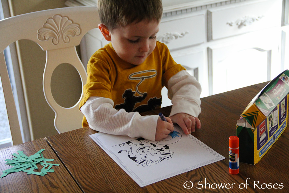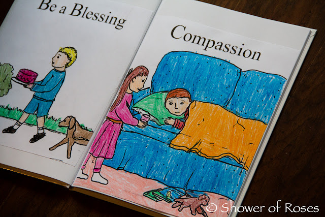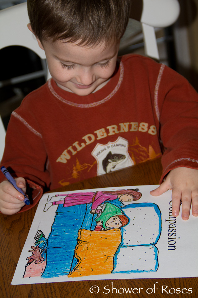 Show Compassion is the theme for this week's Writing ABC's on Little Hearts by Pondered In My Heart. Snuggles colored the picture and added it to his book.