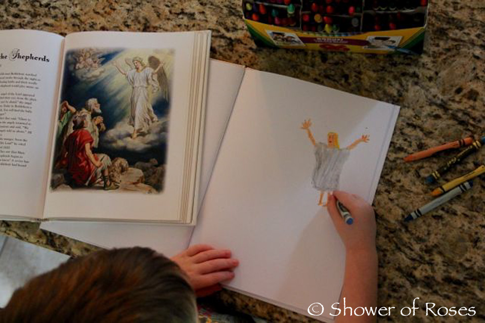 Continuing Snuggles' Bible Narrations and Picture Study for this year... We read about the Christ Child from Classic Bible Stories: A Family Treasury. After I read the story to Snuggles' he narrated it back to me and then illustrated a page in his book based on the picture provided.