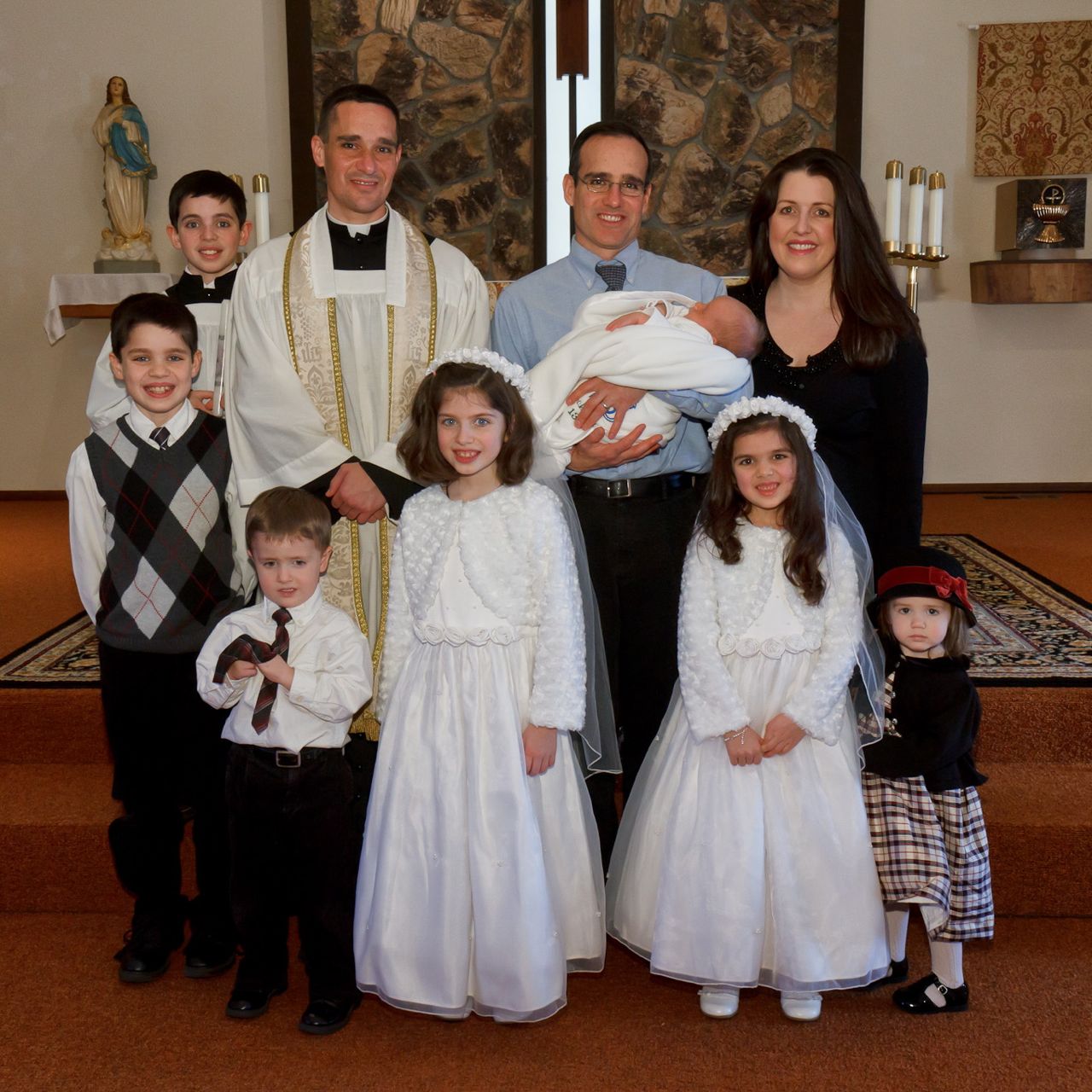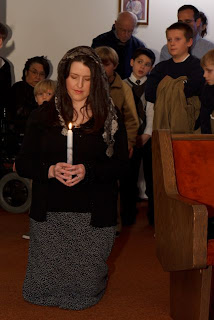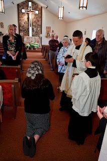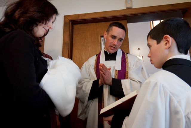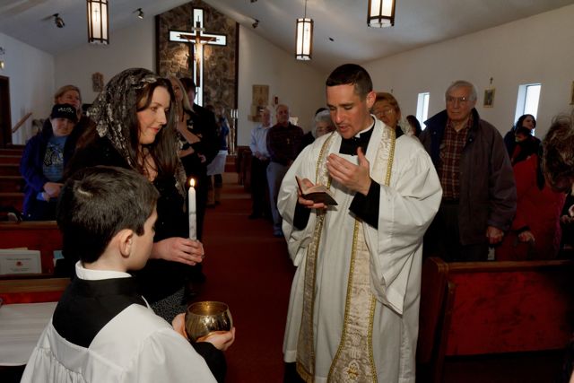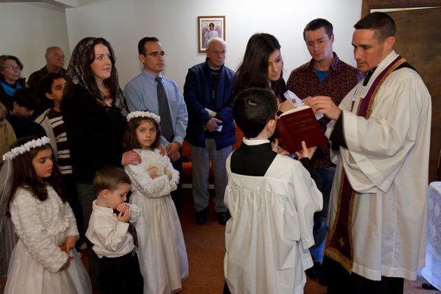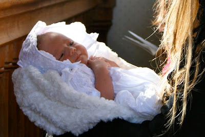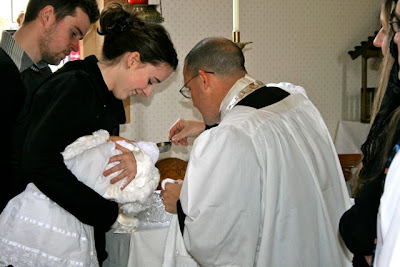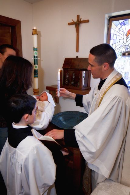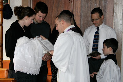 This past Monday, on the feast of the Holy Innocents, our little Rose was baptized, according to the Traditional Rite, by one of her uncles. Her Godparents were not able to make it to the baptism, so two of my siblings stood in as proxies.