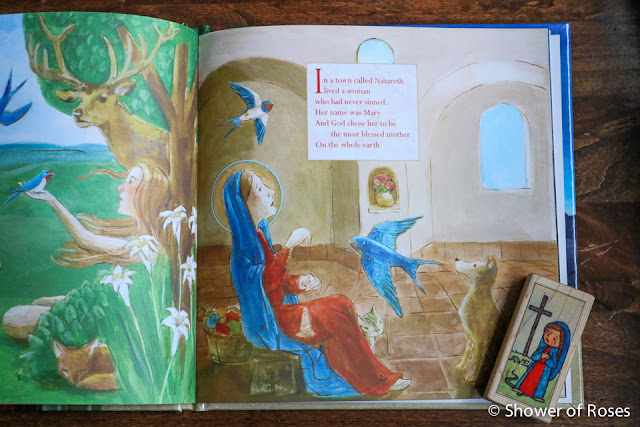 Building the Way to Heaven: The Tower of Babel and Pentecost is the third book (so far!) in the "Old and New" series written by Maura Roan McKeegan and reverently illustrated by Ted Schluenderfritz. The first two books (The End of the Fiery Sword: Adam & Eve and Jesus & Mary and Into the Sea, Out of the Tomb: Jonah and Jesus) are definitely on our list of favorite Catholic picture books for children and I'm happy to add another book from this wonderful series, introducing children to the intriguing study of biblical typology, to our collection. I snapped a few pictures to share with you all.