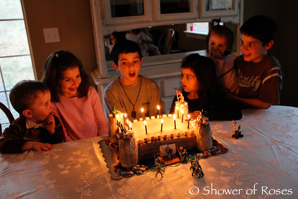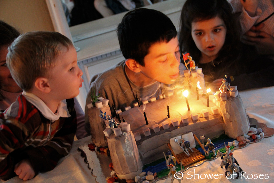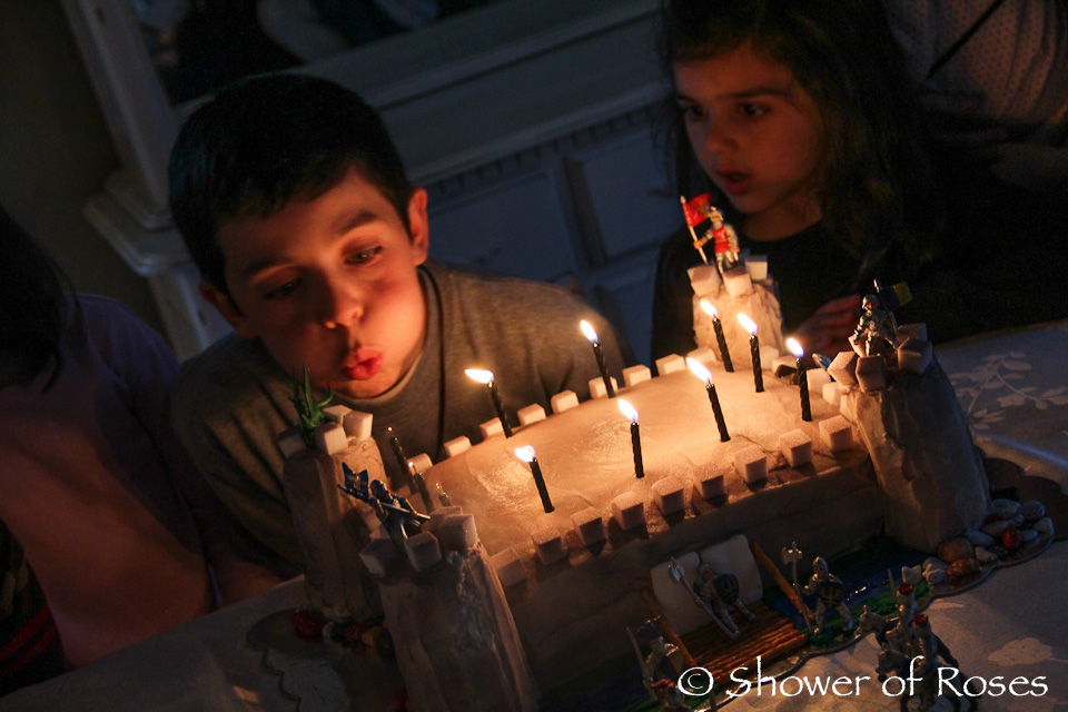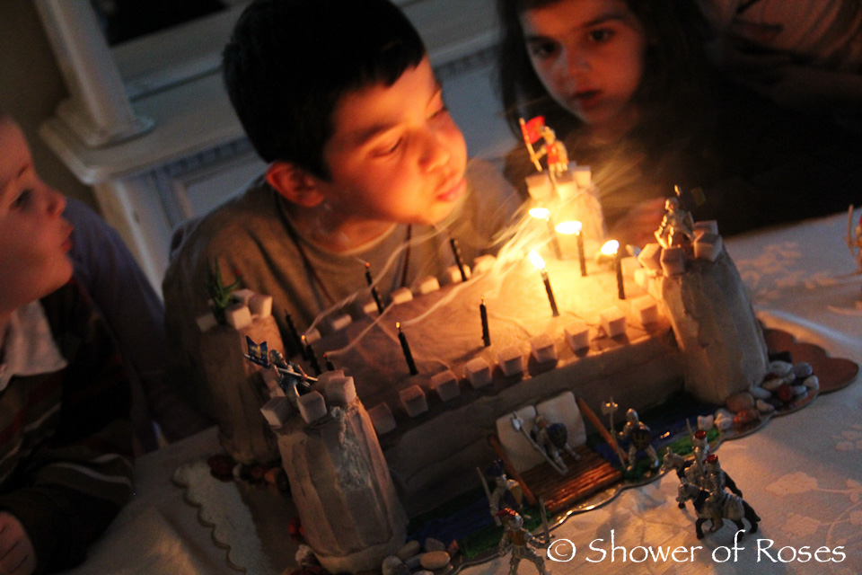 Yesterday we celebrated Snuggles' 9th birthday! He requested a Knights & Dragons theme and asked if I could please make him a castle cake this year.