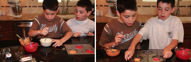 I baked one box of cake mix in each of the 9x9 bakers and split the third cake mix between the two small round pans and 8 cupcakes.