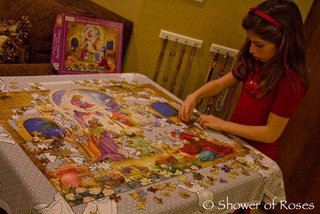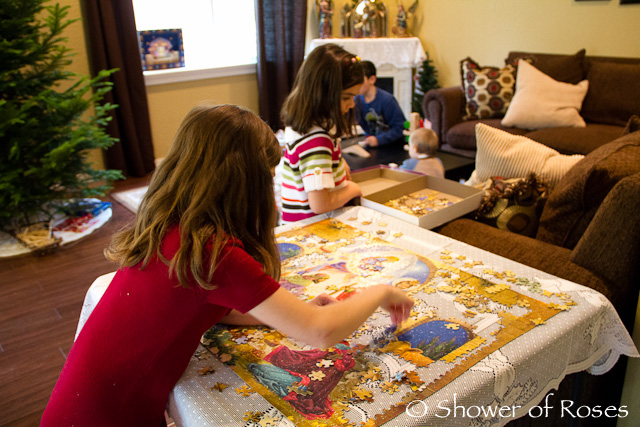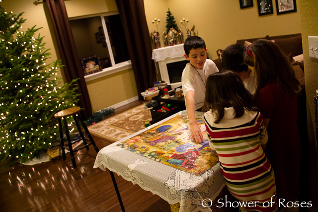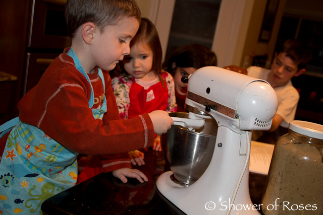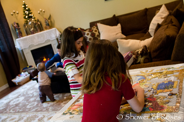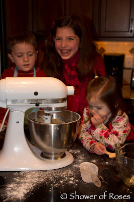 We started with the red frosting last night, and finished decorating the cookies today, once we picked up some more white cookie icing on our way home this morning. The children all really enjoyed decorating their own cookies, and helping with the rest! (The big kids helped Snuggles and Rose decorate their cookies.) I thought they did an excellent job!