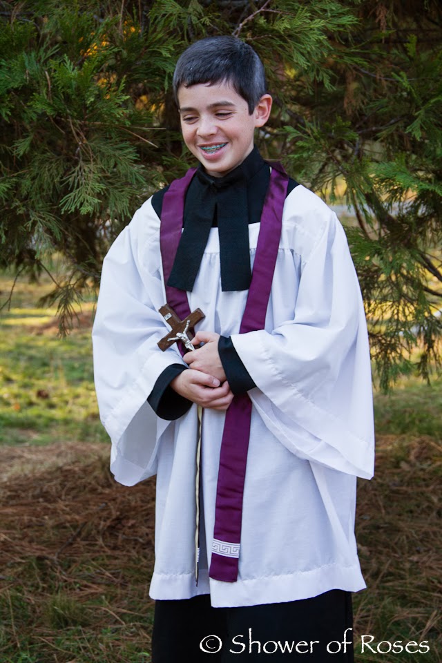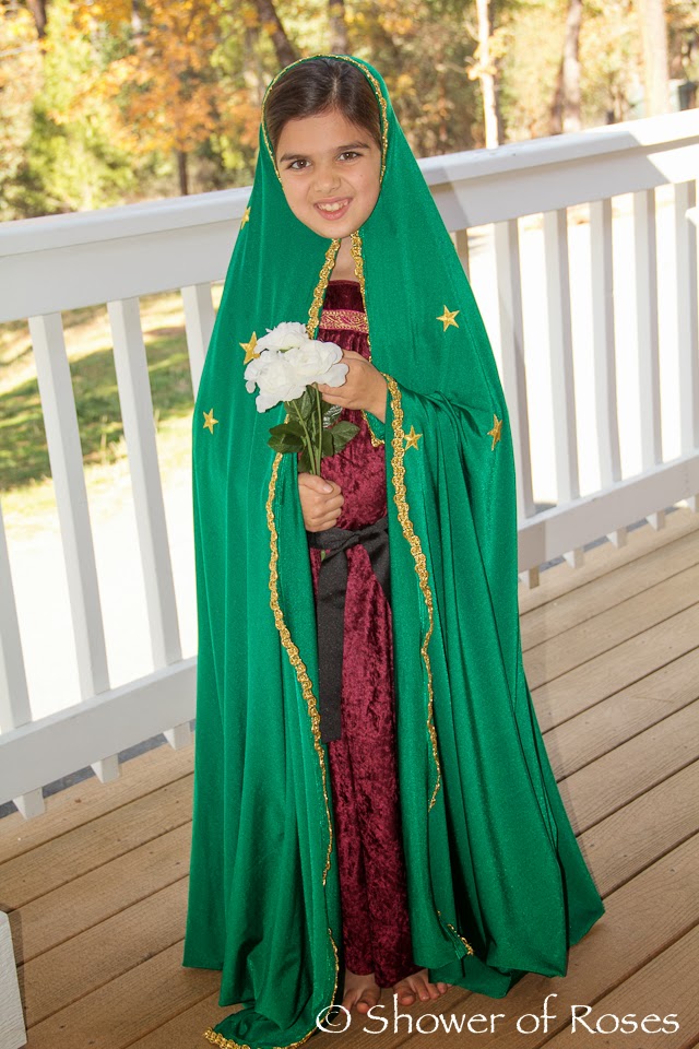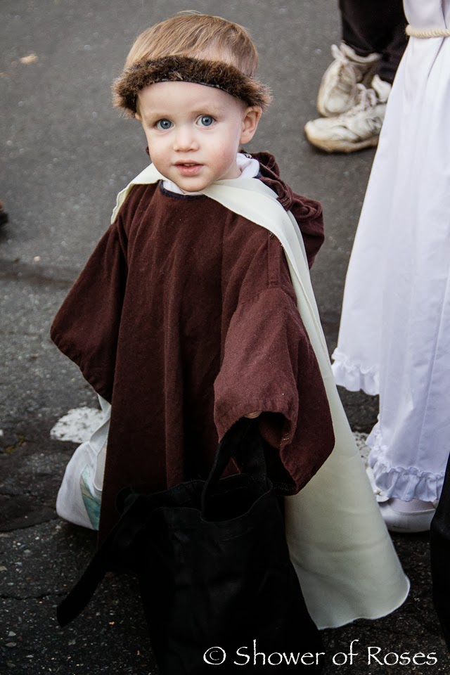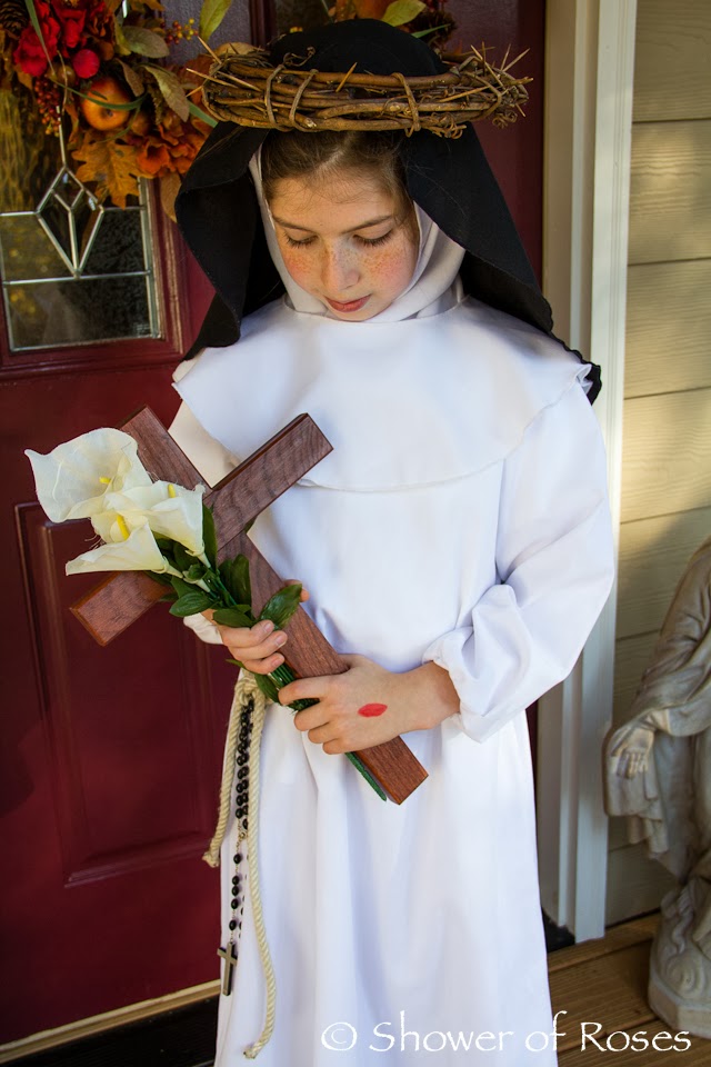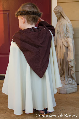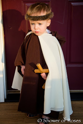 When we were over at the coast we happened to see some (way overpriced) costumes that would be perfect for St. Margaret and St. Helena… I happened to find them online at a more affordable price and order two saintly "princess" dresses for the girls. You can find the Victorian Rose Costume here and the Crimson Costume here. Now we just need to go to the craft store for some supplies to make a couple crowns to go with the pretty dresses! Two down… Five more to go! ;)