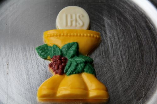 For this symbol I decided to order one of the beautiful new Pysanky Bread Basket Liners from Catholic Embroidery. I know it isn't embroidered with the IHS, but it does have the Greek letters for Christ: IC XC and Greek verb for triumph: NIKA. (If you order this, or any of the Catholic Aprons, directly from this Catholic Cuisine page I will receive a commission. Thank you!) A few more suggestions: A Mass Tote embroidered with the IHS symbol would be another great alternative. We love ours! The Chalice Notepad from Saints Galore would be lovely as well!