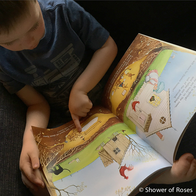 {He loves to flip through his new book counting the five "rabbit children" on each page.}