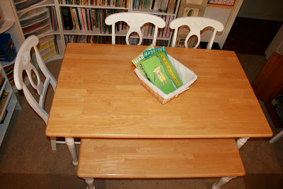 Since taking this picture I did give-up on trying to squeeze around the end chair, and it has been moved out for now. We don't really need it right now anyway. You can also see the beginnings of the girls Madeline Lapbook in the basket on the table... It is still in progress and the girls have been having so much fun with this one.