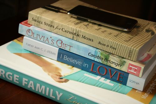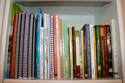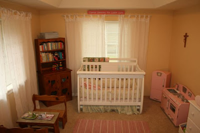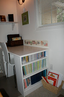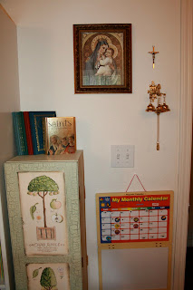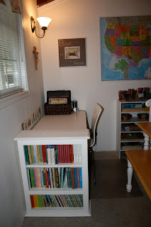 The desk on the left has a built in bookcase on the end which I use for our CD's (Glory Stories, Music Masters, Wee Sing, and a few others) as well as all of our Father Lovasik books and other religious books.