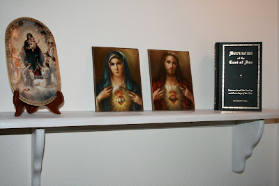 saint magnets, and a little cabinet which holds some more books and craft supplies.