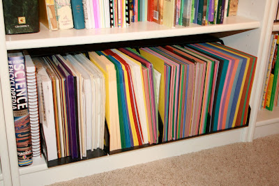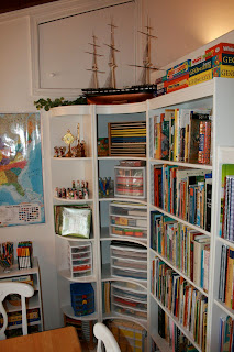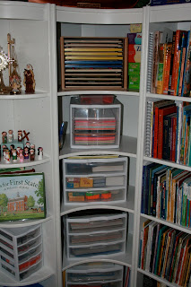 My plan is to keep items I am not using this year (or season) up and out of the way. I also want to try and find (or perhaps make) a few curtains that would nicely hide it all. The rest of the craft supplies, the ones we use on a frequent basis, are now being stored in my closet -- and another work in progress as I try to organize it all, but it is coming along nicely.