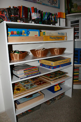 Our Art Shelf is below the map, on top of some stacking shoe organizers which are now holding puzzles, pattern blocks, lacing shapes, and other