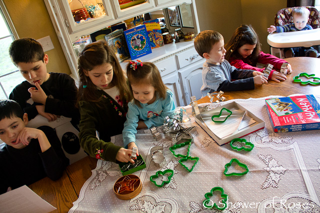 "Three (Seven in our case!) anxious little faces look on with great anticipation of receiving a sweet morsel when it is baked. Their dark eyes glisten as they listen to the story of the Christ child as each cutter tells his part."