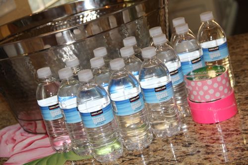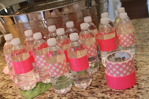Oh!! After seeing this idea recently on Pinterest, I had to pick up some pink Duct Tape for our water bottles. Isn't this the greatest idea?! Unlike printed water bottle labels from your computer, these bottles of water wrapped with a strip of Duck Brand duct tape can go right in the ice tub looking pretty, without any ink bleeding!